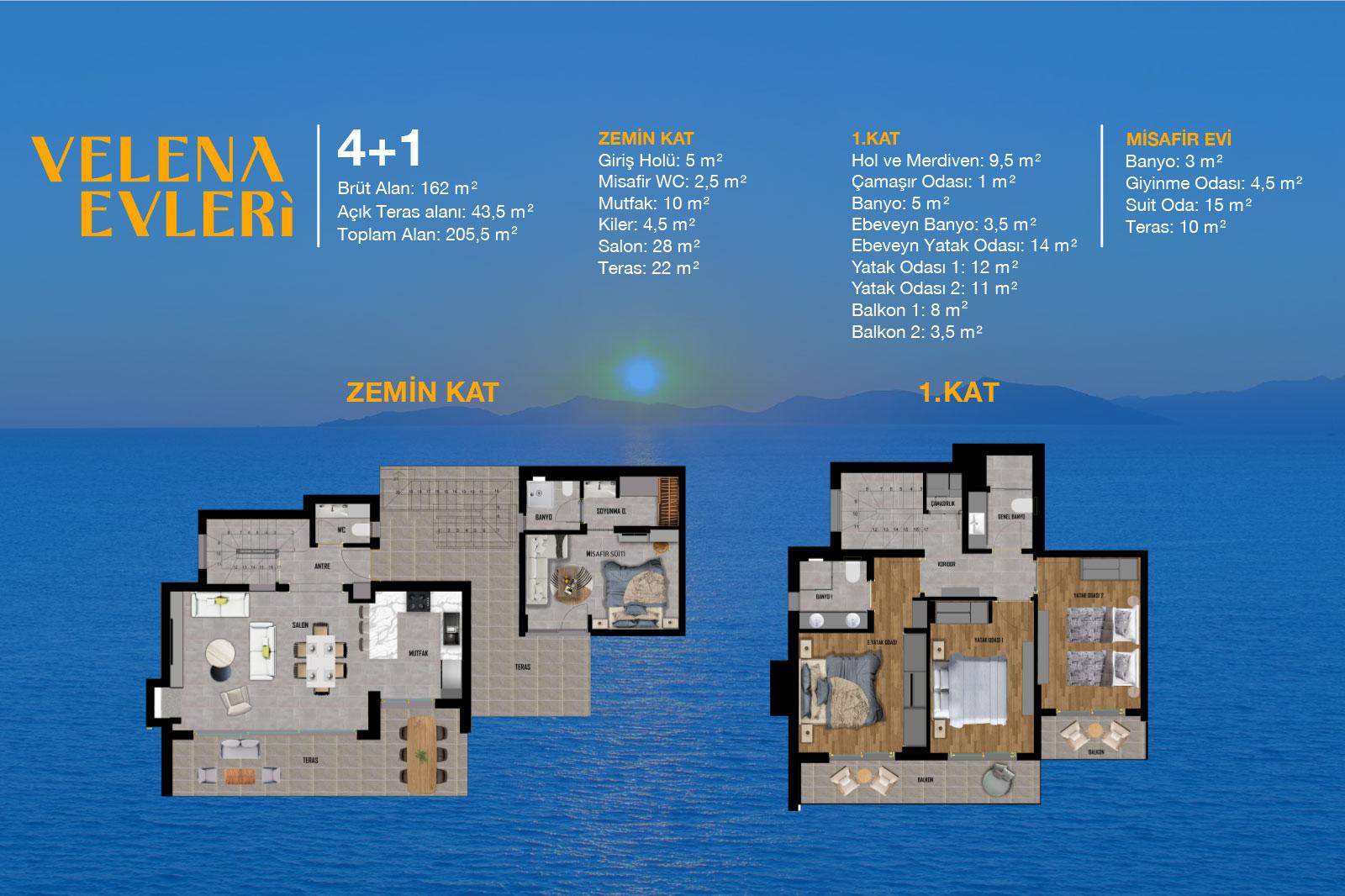 Modern mimarinin fonksiyonel çizgileri ile dört mevsim yaşam için tüm detayların düşünüldüğü Velena Evleri, yerel taş estetiği, mavi ve yeşilin uyumlu birlikteliğinden oluşan peyzajı ve özel havuzu ile sizi bir Bodrum rüyasına davet ediyor.